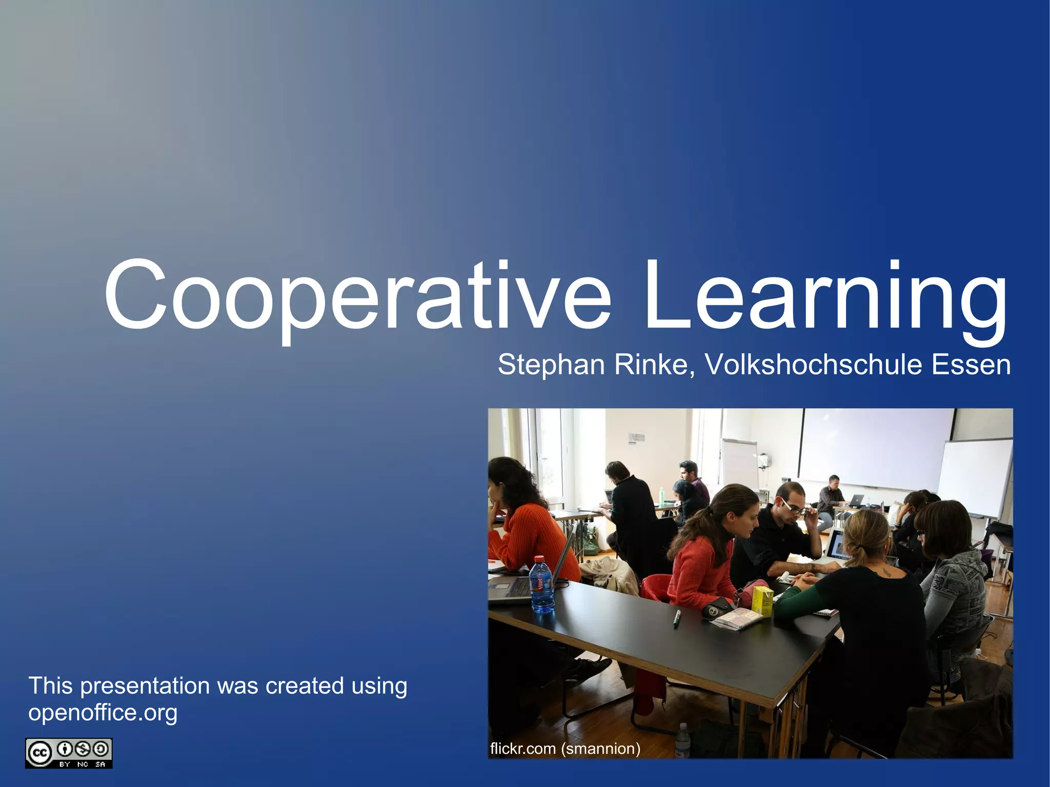 The document is a presentation on cooperative learning, discussing its advantages and disadvantages. It includes questions about institutional changes necessary for implementing cooperative learning and identifies potential partners for support. The slides are shared under a Creative Commons license, with sources for images provided within the presentation.