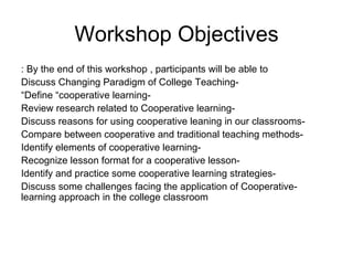 The document discusses cooperative learning in college classrooms. It defines cooperative learning and compares it to traditional teaching methods. It reviews research that shows cooperative learning leads to higher achievement, motivation, and development of social skills compared to competitive or individual learning. The document provides examples of cooperative learning strategies, roles in cooperative groups, and challenges of implementing cooperative learning in college.