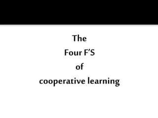 Cooperative learning involves organizing students into small groups so they can work together to maximize their own learning and each other's learning. It aims to provide academic and social learning experiences. Key aspects of cooperative learning include positive interdependence, individual accountability, promotive interaction, developing social skills, and group processing. Structuring learning activities in this way has benefits like increased understanding, memory, and positive self-image for students.