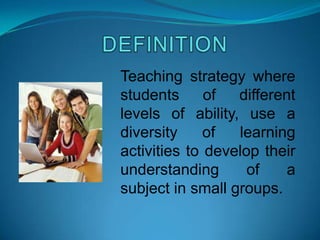 Cooperative learning is a teaching strategy where students work in diverse, small groups to develop their understanding of a subject. It involves positive interdependence, individual accountability, face-to-face interaction, interpersonal skills, group processing. There are formal short-term groups, informal minute-long groups, and long-term base groups. Group size works best small, around 3-5 students. Activities include Think-Pair-Share, interviews and reviews. Advantages are increased achievement, understanding between students, self-esteem, and social and study skills.