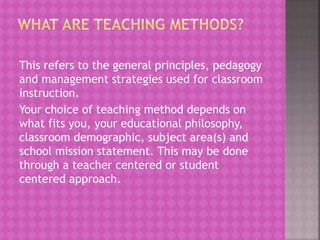 The document discusses instructional methods and strategies for effective teaching, emphasizing the importance of choosing approaches that align with educational philosophy and classroom dynamics. It highlights various cooperative learning techniques, their benefits, such as improved academic performance and student engagement, as well as potential challenges, including the need for conflict resolution and ensuring all students participate. The document also underscores the significance of fostering interpersonal skills through group work and structured interactions.
