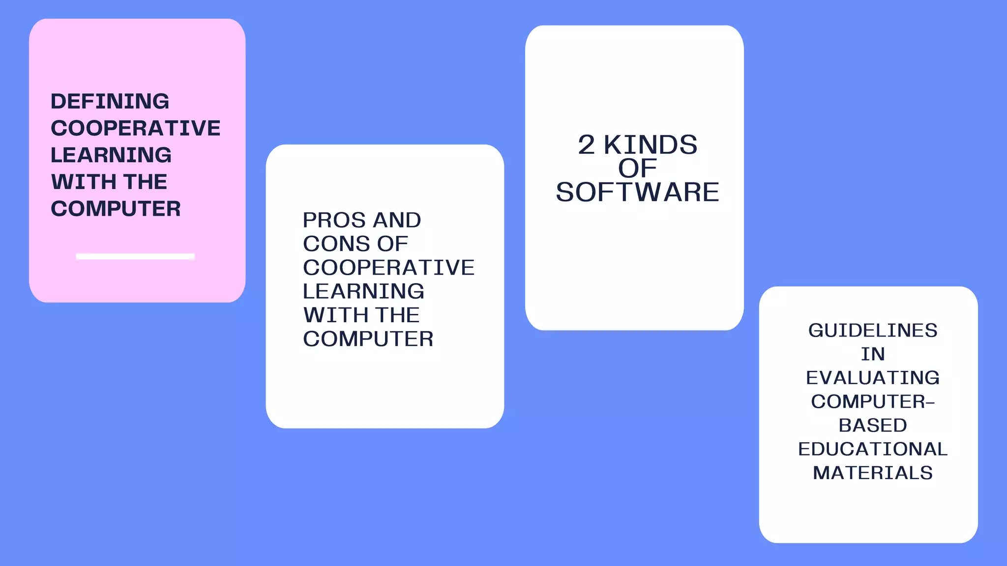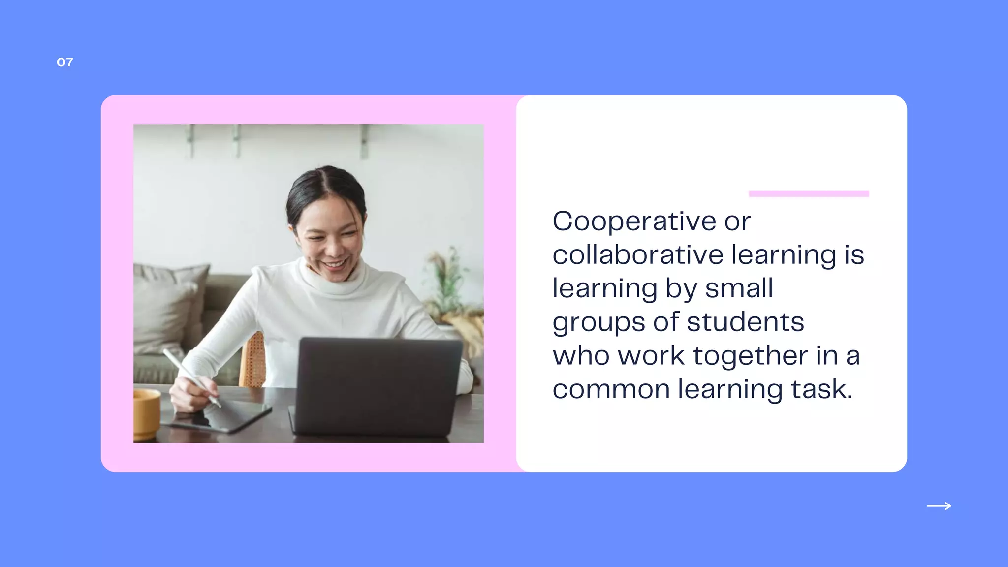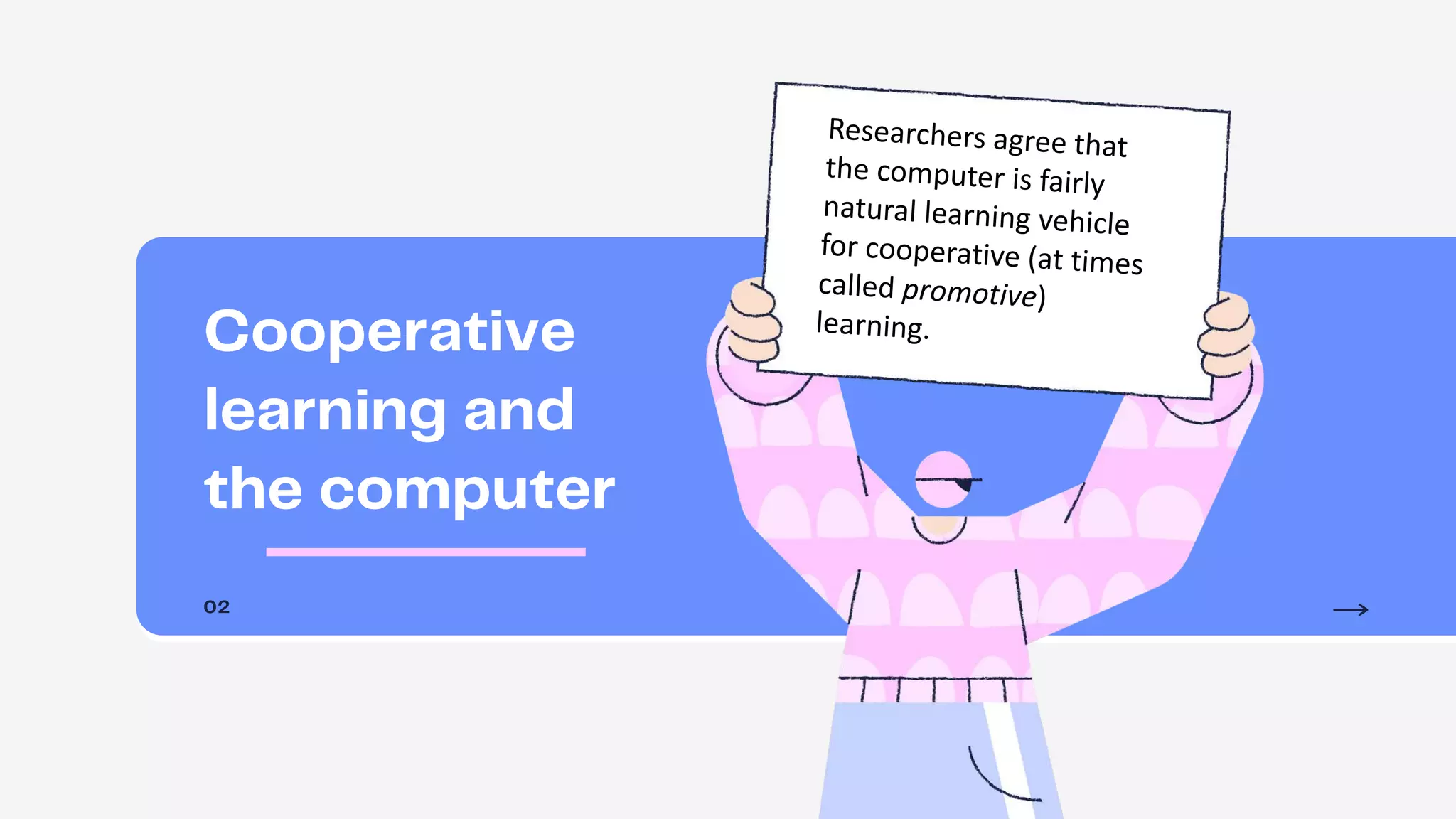 Five elements are needed for cooperative learning: a common goal, interdependence, interaction, individual accountability, and social skills. Cooperative learning encourages active learning and motivation, increases academic performance, promotes literacy and language skills, and improves teacher effectiveness. Studies show that students in computer groups interact and help each other, contradicting fears that computers isolate students. Cooperative learning can be implemented online or in classrooms, synchronously or asynchronously, by assigning mixed-ability teams, establishing interdependence, teaching social skills, ensuring accountability, and helping groups process information.