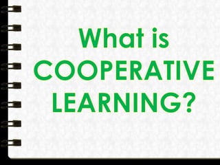 Group learning involves students working together in small groups on common tasks, with shared goals and interdependence. It encourages active learning and increases academic performance by promoting literacy, language skills, and teacher effectiveness, while computers can foster positive social behaviors and serve as a natural vehicle for cooperative learning when students work together in groups with advice and mutual help. Effective cooperative learning involves mixed-ability teams, positive interdependence, teaching social skills, and ensuring individual accountability.