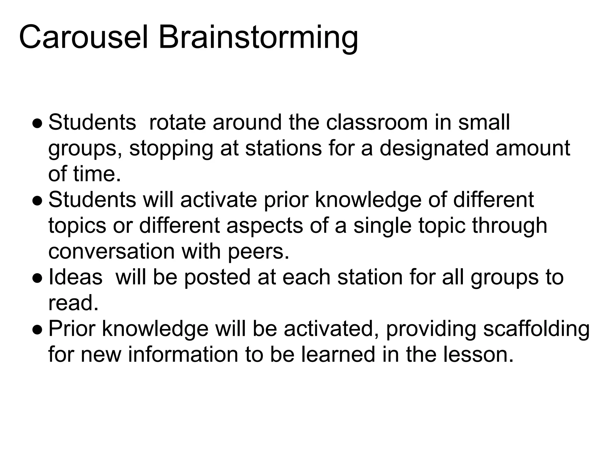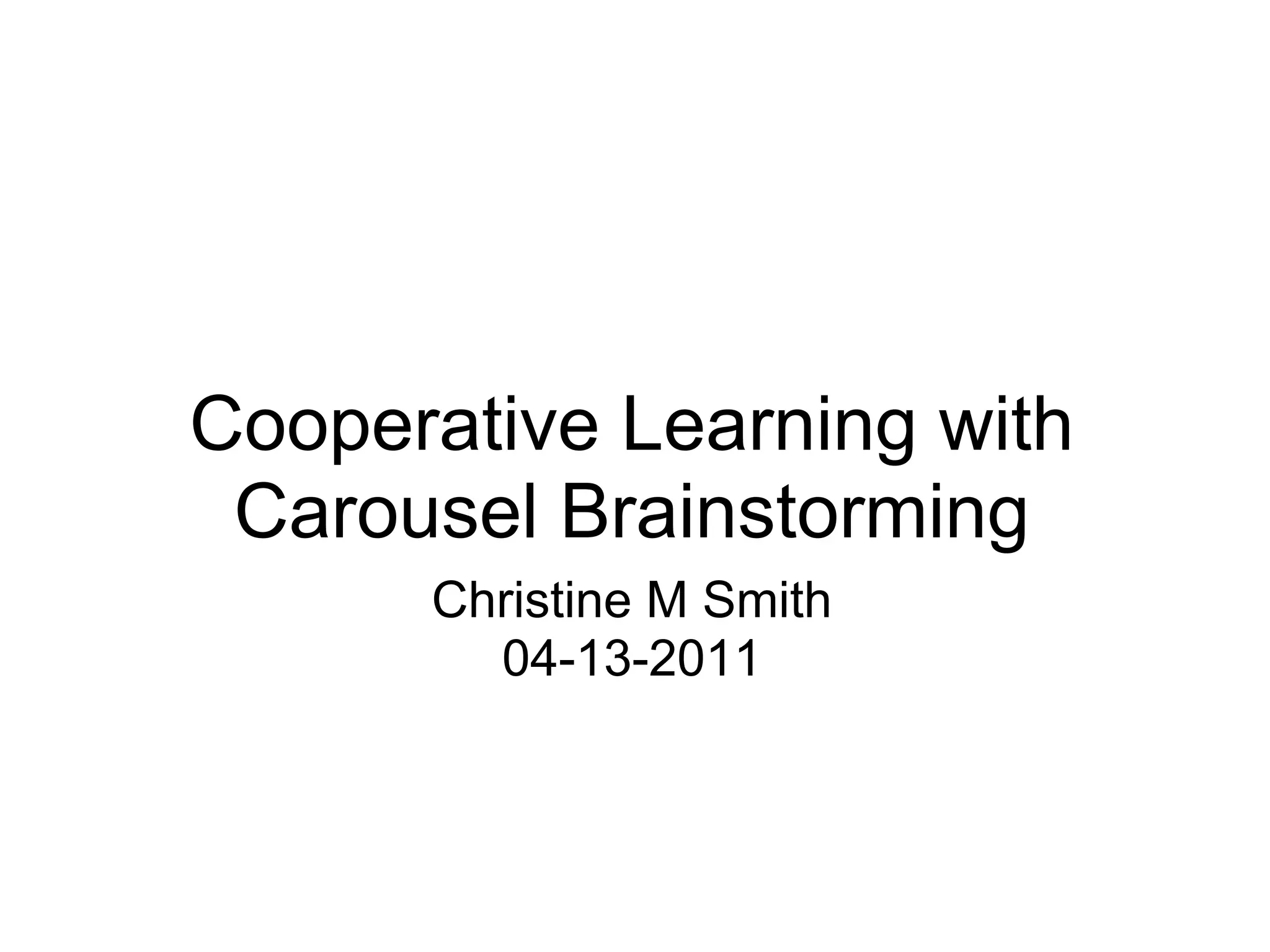 This document describes the cooperative learning strategy of carousel brainstorming. It involves dividing students into small groups that rotate between stations in the classroom, spending designated time at each station brainstorming ideas in response to questions posed. As groups rotate, their ideas are recorded at each station so that all groups can read and build upon the ideas. The roles of recorder, speaker, and mediator are assigned to structure participation. Sample questions and a wrap-up activity are provided as an example for using this strategy to brainstorm books related to social justice themes.
