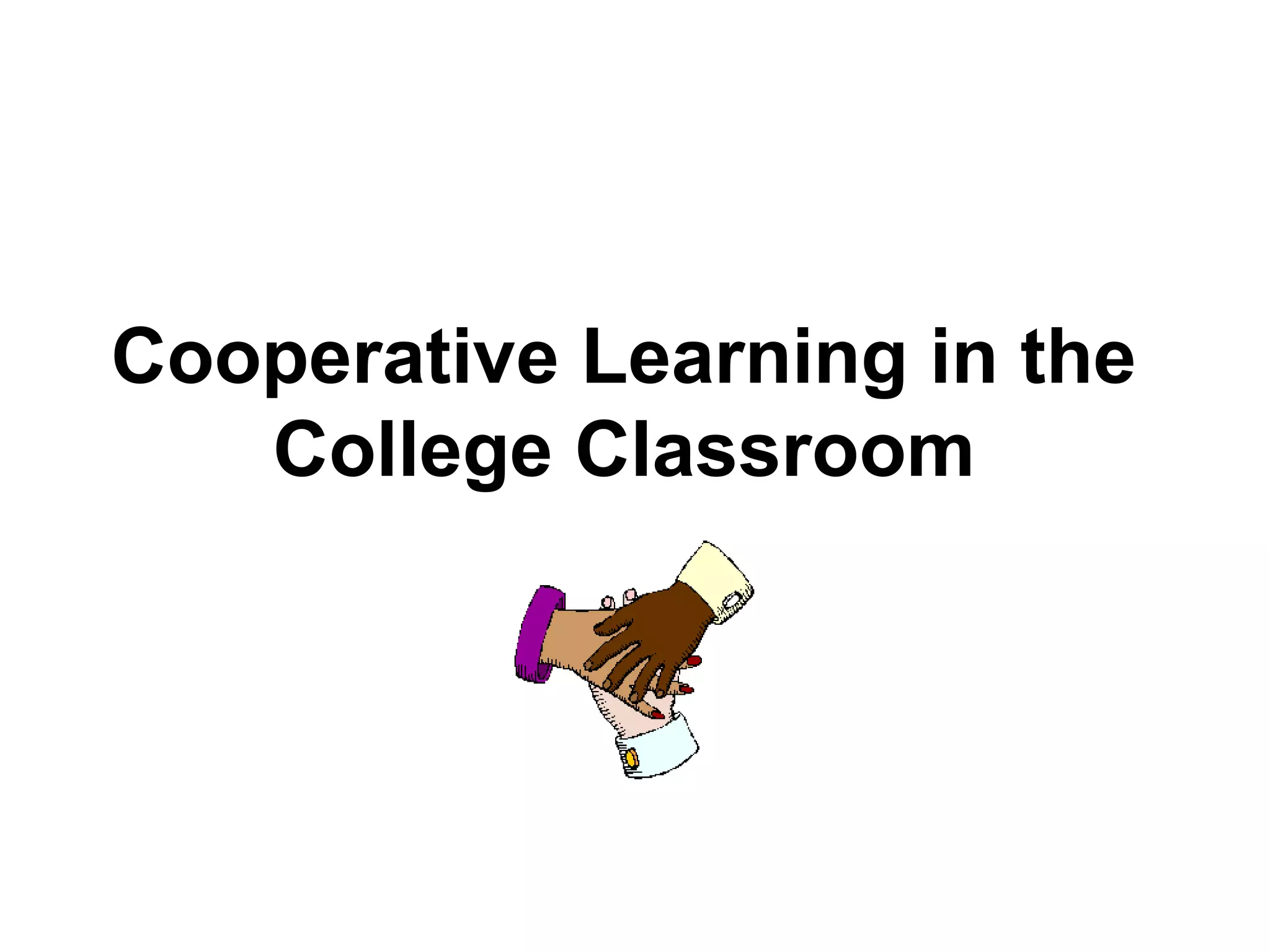 This document discusses cooperative learning and its use in college classrooms. It begins by outlining the workshop objectives, which are to define cooperative learning, discuss the benefits of using it, identify elements and strategies of cooperative learning, and address challenges. The document then covers defining cooperative learning, reviewing research supporting its benefits to learning and motivation, comparing traditional and cooperative methods, and describing elements like roles, accountability, and processing. It provides examples of cooperative learning activities and grouping patterns that can be used.