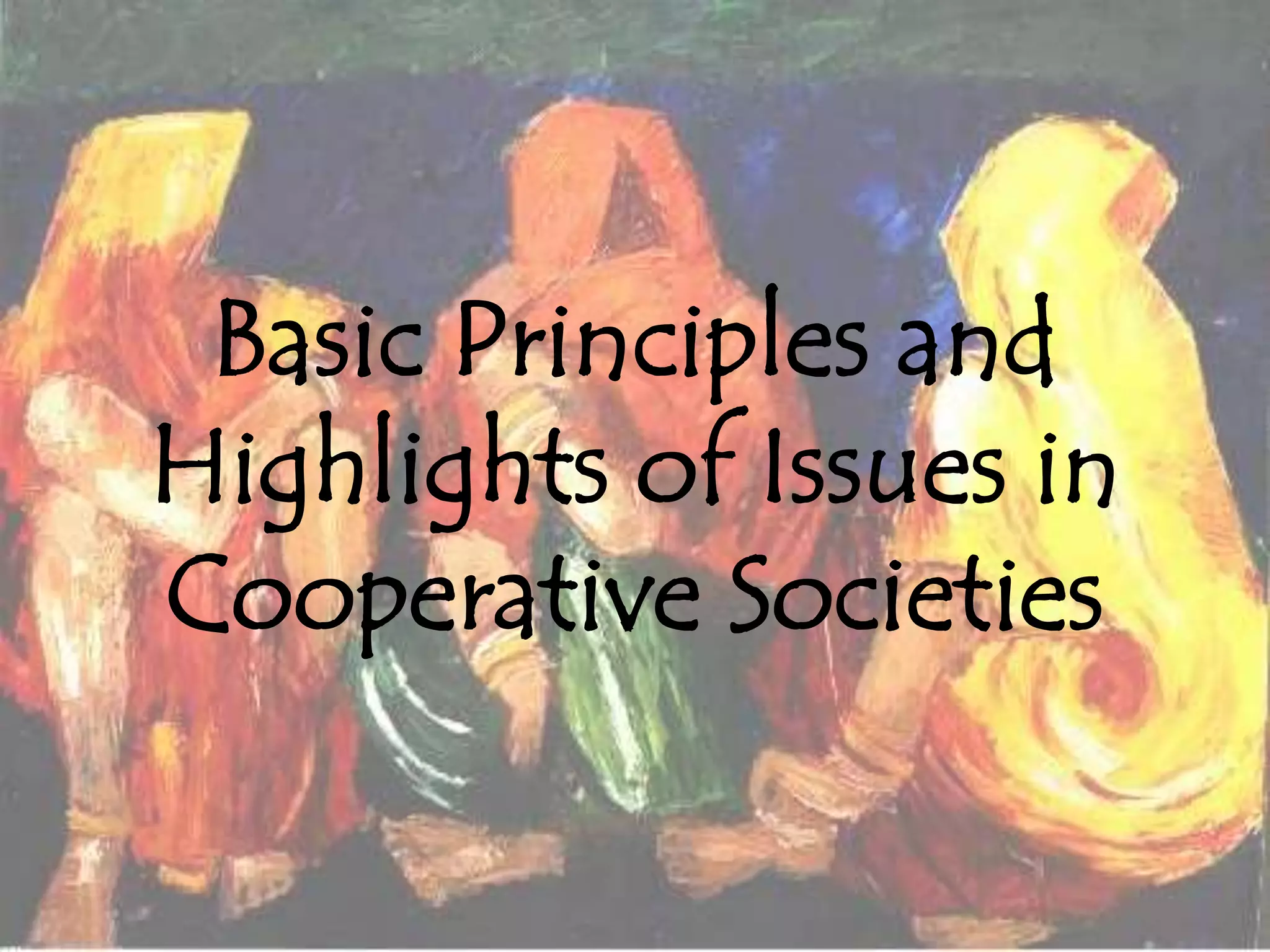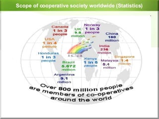 Cooperative societies are autonomous associations that are voluntarily owned and controlled by their members to achieve mutual social, economic, and cultural benefits. They originated in India to help farmers pool resources for credit, procurement of supplies, and marketing of agricultural produce. Key principles include voluntary membership, democratic control by members, and concern for the community. While cooperatives provide benefits like promotion of savings and self-help, they face issues such as dormant membership, lack of participation in management, and political interference. Programs by organizations like NAFED and NCDC aim to support India's cooperative movement.