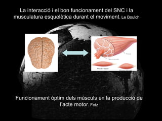 La interacció iel bon funcionament del SNC i la musculatura esquelètica durant el moviment . Le Boulch Funcionament òptim dels músculs en la producció de l’acte motor . Fetz