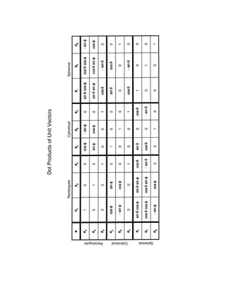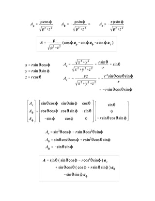 This document defines rectangular, cylindrical, and spherical coordinate systems and describes how to transform vectors between the different coordinate systems using transformation matrices. It also discusses how to define volumes, surfaces, and lines within each coordinate system by specifying constant values for one or more of the coordinates. Finally, it provides an example of transforming a vector and point between the different coordinate systems and evaluating the vector components.