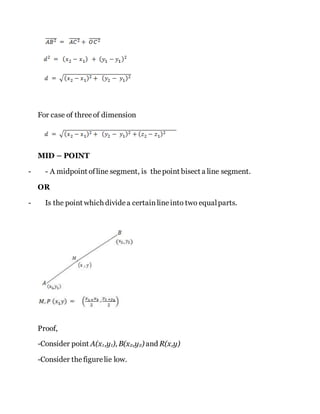 Coordinate geometry is the study of representing geometric figures on two- or three-dimensional planes. Some key concepts in coordinate geometry include: