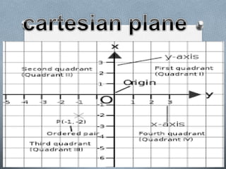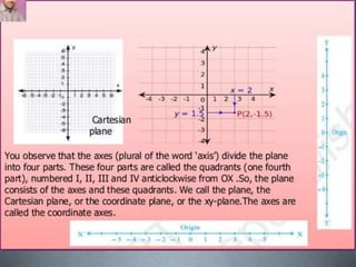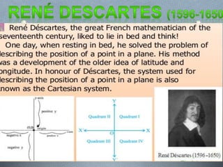 Coordinate geometry was introduced by Fermat and Descartes who did not address the foundational problems that prevented the Greeks from developing this approach. This development was important for science as it allowed geometry to be quantitative and use algebraic methods, making geometry more useful for science and engineering applications through a more systematic approach than the Greek axiomatic style. While lying in bed, the mathematician Rene Descartes saw a fly on his ceiling and wondered if he could precisely describe its location, realizing vague terms like "left" were not enough and hoping to develop a precise method using coordinates.