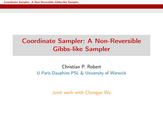 This document describes a new MCMC method called the Coordinate Sampler. It is a non-reversible Gibbs-like sampler based on a piecewise deterministic Markov process (PDMP). The Coordinate Sampler generalizes the Bouncy Particle Sampler by making the bounce direction partly random and orthogonal to the gradient. It is proven that under certain conditions, the PDMP induced by the Coordinate Sampler has a unique invariant distribution of the target distribution multiplied by a uniform auxiliary variable distribution. The Coordinate Sampler is also shown to exhibit geometric ergodicity, an important convergence property, under additional regularity conditions on the target distribution.