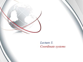 This document discusses various coordinate systems used to define positions in satellite navigation. It describes geocentric systems like ECEF and ECI that use the Earth's center as the origin, as well as topocentric systems that use the observer's location. It also discusses spherical coordinate systems that define positions using radial distance, elevation and azimuth angles. Key systems covered include WGS-84 used in GPS and PZ-90.02 used in GLONASS. While definitions are close, realized coordinates between the two systems can differ by up to 0.5 meters.