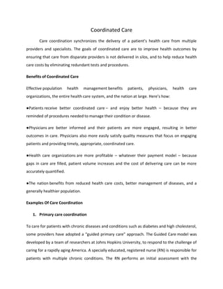 Coordinated care synchronizes health services from various providers to enhance patient outcomes and reduce costs by eliminating redundant procedures. Effective population health management benefits patients, doctors, health organizations, and the entire healthcare system by improving care engagement and filling service gaps. Different coordination models, such as guided primary care and acute care coordination, are crucial for managing chronic and critical health issues, respectively, while addressing the complexities of post-acute care for aging patients.