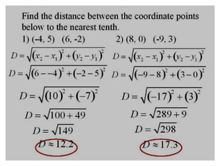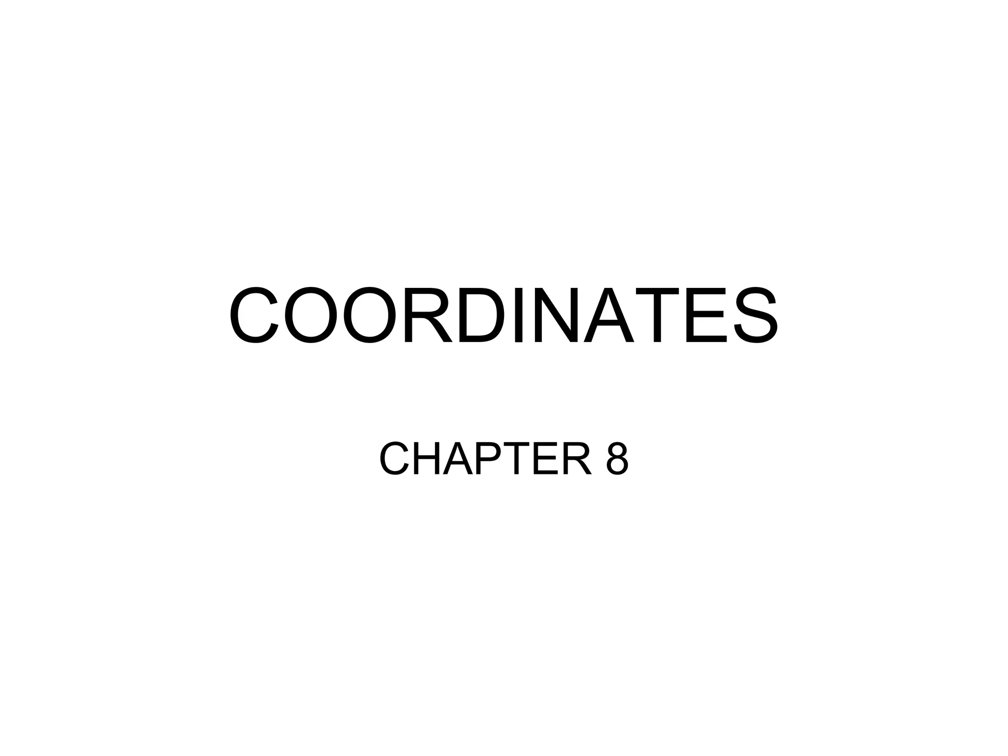 This document outlines the subtopics to be covered in Chapter 8 of a Mathematics textbook, including understanding and using coordinates and scales on coordinate axes, calculating distance between points on the cartesian plane, and finding midpoints. It lists the page numbers and exercise numbers for 4 examples: problems 3a-d and 4a-d on page 20.
