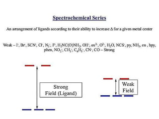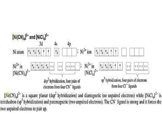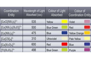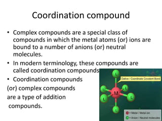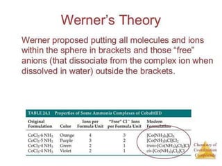 This document discusses coordination compounds and Werner's theory of coordination compounds. It provides definitions and examples of key concepts such as ligands, coordination entities, isomerism and bonding theories. Werner's theory postulated that metals have both primary and secondary valences to form complexes with ligands through coordinate covalent bonds. It successfully explained many features of coordination compounds but had limitations.