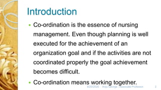 The document discusses the importance of coordination and delegation in nursing management, emphasizing that effective coordination among staff improves operational efficiency and clinical outcomes. It outlines the principles, types, skills, and barriers of coordination and delegation, highlighting their roles in achieving organizational goals. Additionally, it addresses the advantages and disadvantages of delegation, stressing the need for effective communication and teamwork in nursing practice.