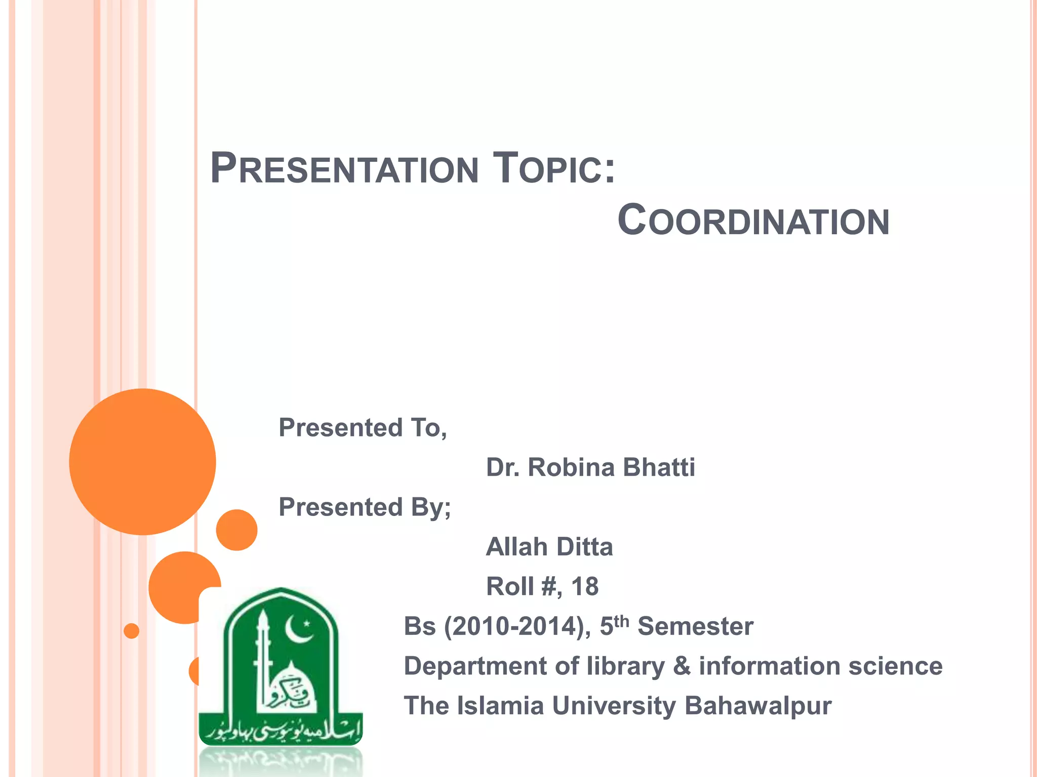This presentation discusses coordination and its importance in organizations. Coordination refers to the organization of different elements to enable effective teamwork. It is a managerial function that ensures business activities are properly adjusted and linked. Coordination encourages team spirit, gives direction, facilitates motivation, optimizes resource use, and helps achieve goals quickly. Methods of coordination include delegation, evaluation, policies and procedures. A successful coordination framework requires leadership commitment, stakeholder buy-in, agreed outcomes, appropriate governance, resources, and performance measurement. A good coordinator exhibits strong leadership and management skills.