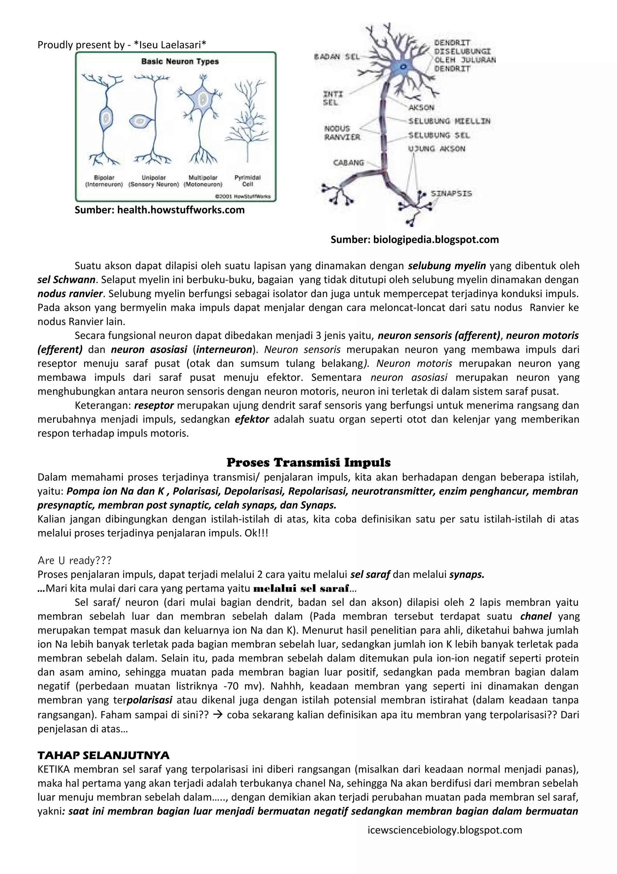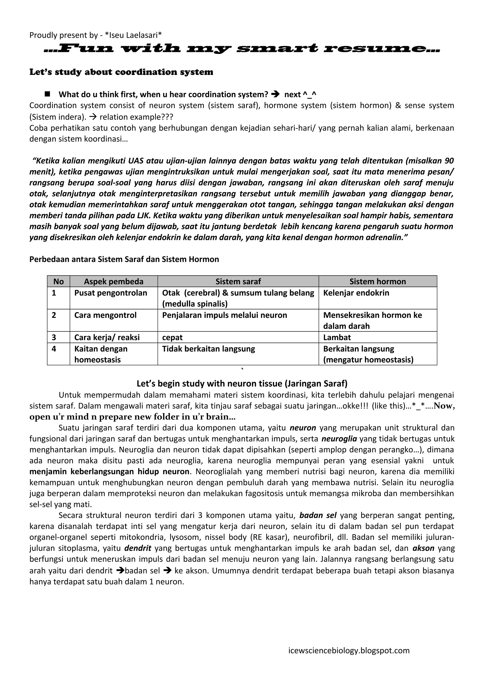 Dokumen ini membahas sistem koordinasi tubuh manusia, yang terdiri dari sistem saraf, hormon, dan indera. Penjelasan mencakup fungsi neuron dan neuroglia serta proses transmisi impuls melalui saraf dan synaps. Juga dijelaskan tentang struktur otak dan sumsum tulang belakang serta bagian-bagian dari sistem saraf pusat dan tepi.