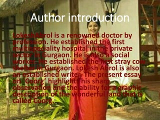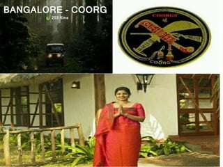 The document provides information about Coorg, a district in Karnataka, India. It describes Coorg as a beautiful land of rolling hills located between Mysore and Mangalore. Coorg has suitable weather year-round and is known for its coffee plantations, spices, and abundant rainforests. The people of Coorg, known as Kodavas, are brave warriors who differ somewhat from mainstream Hindus in their customs and traditions. Coorg offers visitors scenic beauty, opportunities for adventure sports, and glimpses of India's diversity.