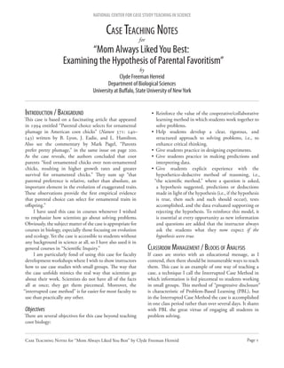 This document provides teaching notes for using a scientific case study on parental favoritism in American coots. The case study examines how scientists investigated whether parent coots favor ornamented chicks over non-ornamented chicks through selective feeding. The teaching notes describe presenting the case study information to students in stages to mimic how scientists progressively learn new details, encouraging hypothesis generation and experiment design. Students work in small groups to analyze each new part of the case before receiving more information, promoting critical thinking and the scientific method. The interrupted case method engages all students in collaborative problem-solving and reinforces objectives like experimental design and data interpretation.