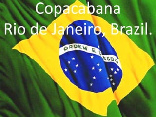 Copacabana is a famous beach located in Rio de Janeiro, Brazil. It is over 4km long and known for its scenic views and vibrant culture. The beach hosts massive New Year's Eve celebrations each year that attract millions of revelers. It is also a popular destination for beach soccer tournaments. The surrounding Copacabana neighborhood is densely populated and has a high quality of life, though some slums also exist in the area. The beachfront promenade is a famous landmark designed with a geometric wave pattern. Local cuisine features ingredients like rice, beans, fish, and tropical fruits.
