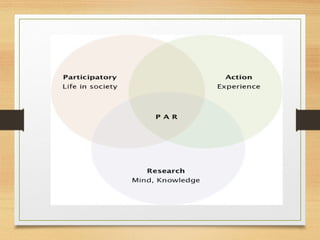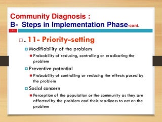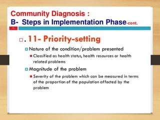 This document discusses various concepts related to community health assessment and intervention planning. It begins by defining community diagnosis/assessment as the process used to determine a community's health status. It then discusses different types of community diagnosis approaches, including participatory action research (PAR), and compares traditional vs. PAR approaches.