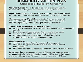 The document outlines the various phases of a community organizing process - including pre-entry, entry, organization-building, action, evaluation, and exit. It discusses criteria for selecting community health concerns to prioritize for intervention. Key elements of social mobilization like organizational development, capital formation, training, and socio-economic development initiatives are also summarized.