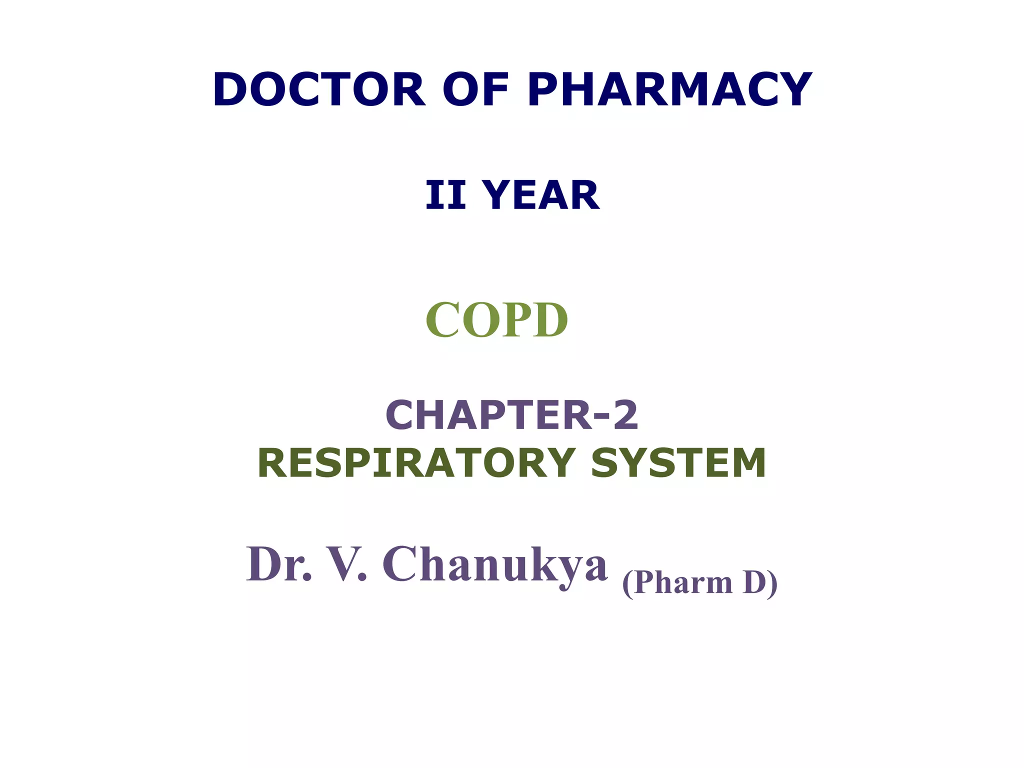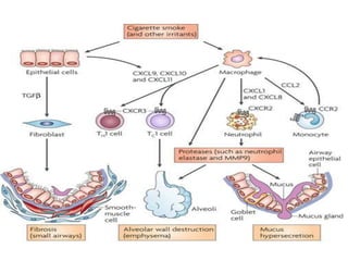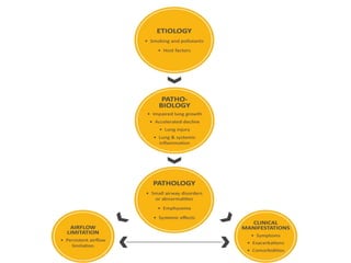 Chronic Obstructive Pulmonary Disease (COPD) is characterized by irreversible airflow limitation caused by progressive lung inflammation and damage, primarily due to tobacco smoke and environmental factors. It is a leading cause of morbidity and mortality worldwide, with symptoms including chronic cough and dyspnea that can escalate, requiring careful diagnosis and management strategies. Treatment includes smoking cessation, pulmonary rehabilitation, bronchodilators, and corticosteroids, aimed at improving lung function and quality of life.