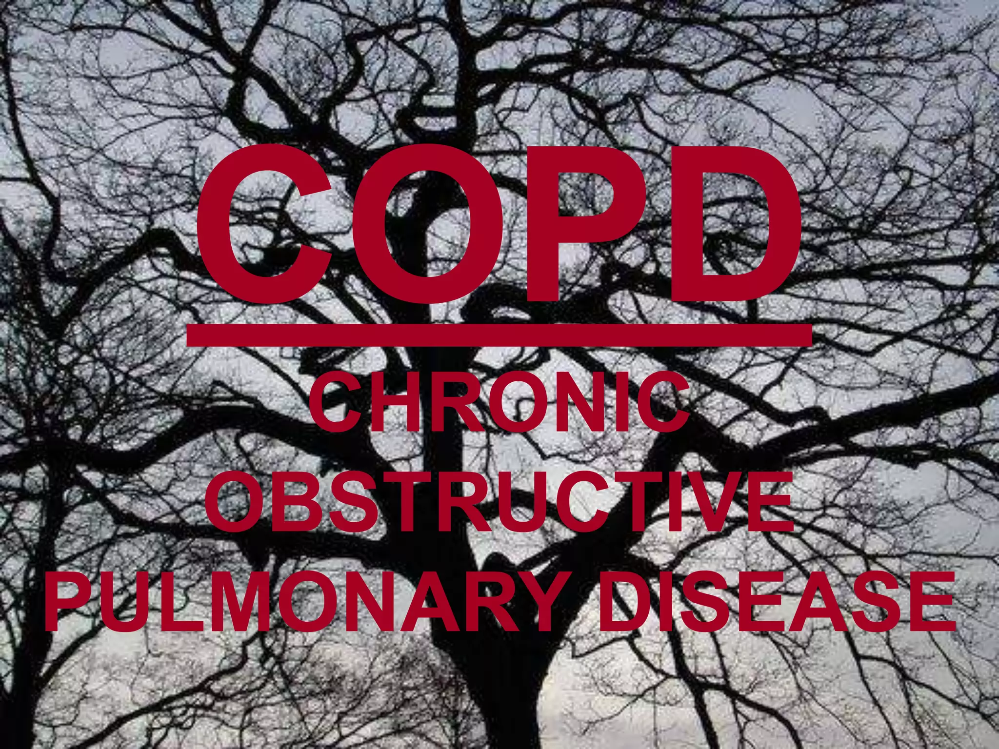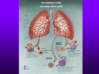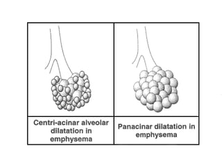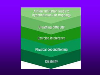 Chronic obstructive pulmonary disease (COPD) is a progressive lung disease characterized by airflow obstruction and breathlessness. It encompasses chronic bronchitis and emphysema and is usually caused by smoking. Symptoms include chronic cough, sputum production, shortness of breath, wheezing and chest tightness. Diagnosis involves lung function tests showing reduced airflow and chest imaging may show signs of emphysema like bullae. Treatment focuses on smoking cessation and medications can provide short-term relief of exacerbations and long-term management of symptoms.