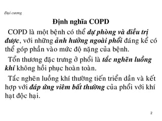 COPD (bệnh phổi tắc nghẽn mạn tính) có thể gây ra các vấn đề nghiêm trọng về hô hấp và có liên quan đến tỷ lệ mắc bệnh và tử vong cao, đặc biệt ở những người trên 40 tuổi. Các yếu tố nguy cơ chính bao gồm hút thuốc, ô nhiễm bụi, và di truyền, trong đó tỷ lệ mắc bệnh tăng theo tuổi và giới tính, nam lớn hơn nữ. Tình trạng này tác động tiêu cực đến chất lượng cuộc sống và yêu cầu theo dõi và can thiệp y tế kịp thời.