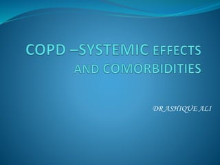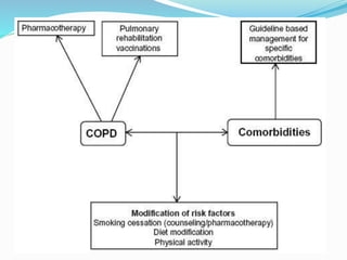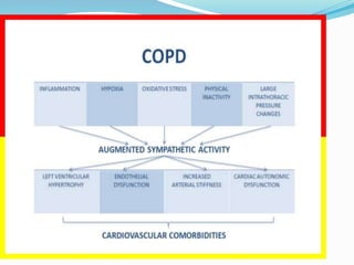 This document discusses systemic inflammation and comorbidities in COPD. It notes that COPD is associated with various important comorbidities beyond the lungs, and inflammation is seen systemically, not just in the lungs. Common comorbidities discussed include cardiovascular diseases like heart disease, hypertension, and stroke. It also mentions increased risk of osteoporosis, diabetes, lung cancer, and other conditions. The systemic inflammation in COPD can be caused by factors like smoking and hypoxia and may contribute to the development and severity of these comorbid conditions.