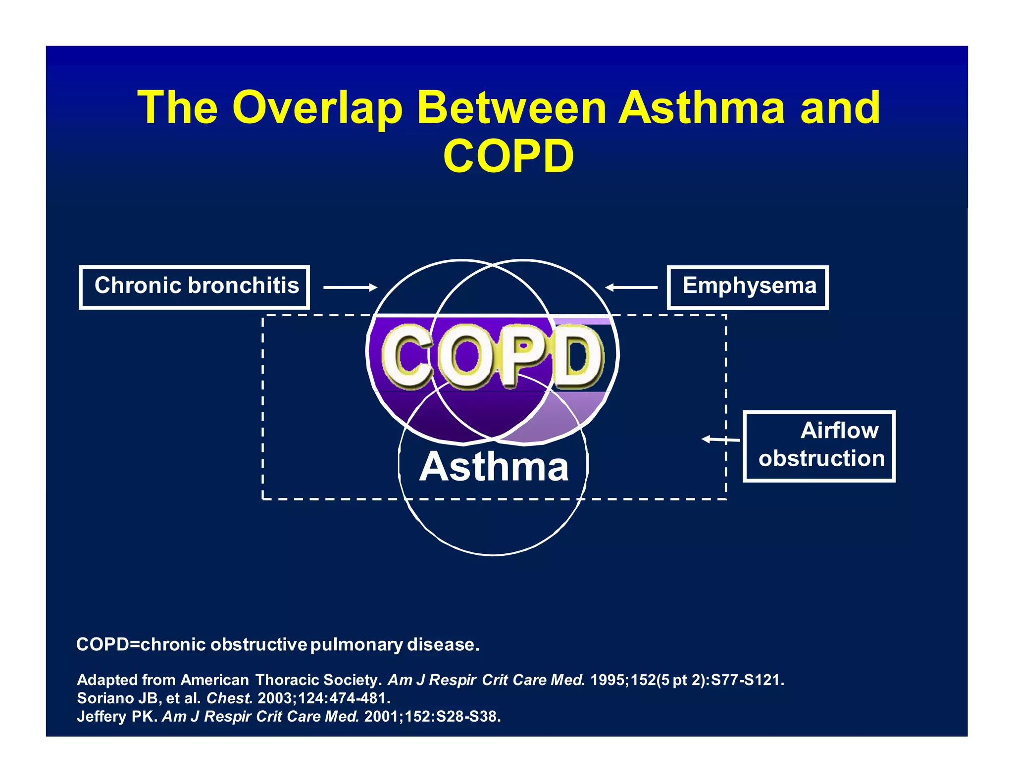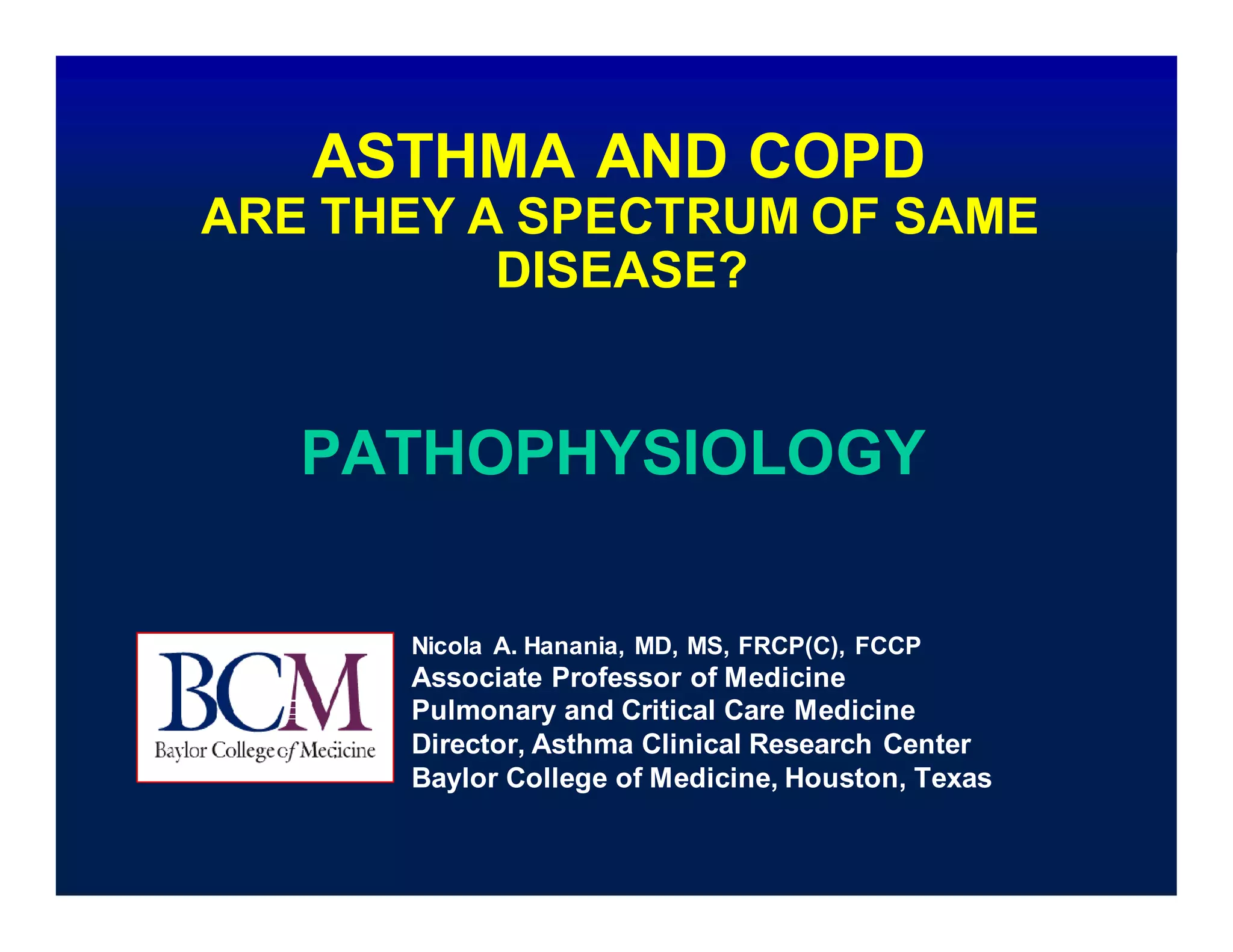 Asthma and COPD share some similarities in their pathophysiology such as airway obstruction, inflammation, and progressive loss of lung function. However, they also have key differences. Asthma typically causes intermittent airflow obstruction that is often reversible, along with eosinophilic inflammation and airway remodeling. COPD usually results in progressive and irreversible airflow limitation due to emphysema and chronic bronchitis involving neutrophilic inflammation and systemic consequences. While the presence of reversibility does not distinguish the two, their underlying inflammatory processes and structural lung changes differ substantially.