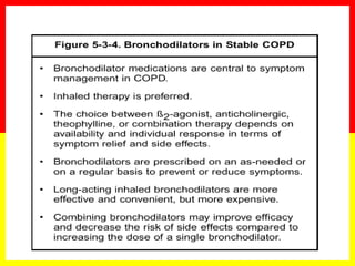 COPD is a progressive lung disease characterized by breathlessness. Smoking is the primary risk factor. The disease involves inflammation in the lungs over many years leading to damage of lung tissue and airflow limitation. Symptoms worsen over time and include cough, sputum production, and shortness of breath. Lung function progressively declines and hyperinflation develops due to air trapping. Underdiagnosis is common and spirometry is required for diagnosis. COPD has systemic effects and frequent exacerbations increase mortality rates.