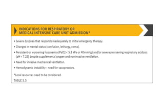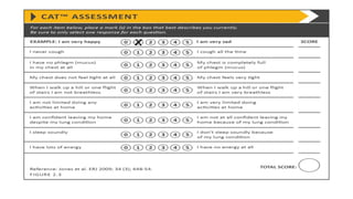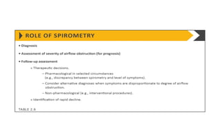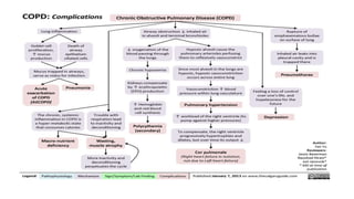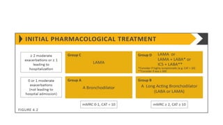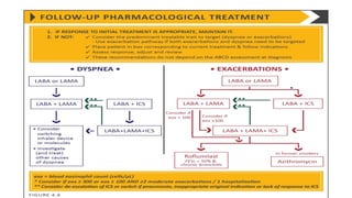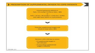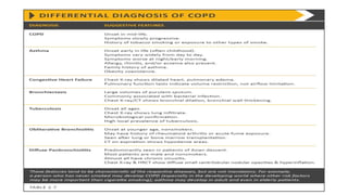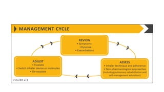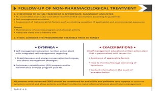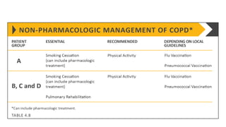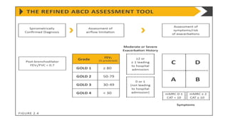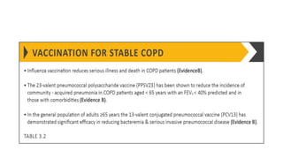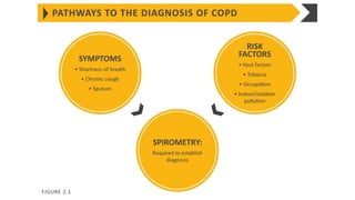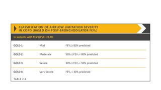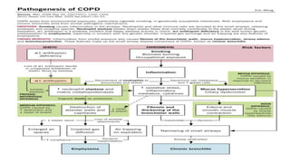 COPD is a common lung disease characterized by airflow limitation caused by exposure to noxious particles. It includes chronic bronchitis and emphysema. Globally, COPD affects over 300 million people and causes over 3 million deaths annually. The major risk factor is tobacco smoking. Symptoms include dyspnea, cough, and sputum production. Exacerbations are defined as worsening of symptoms and require treatments like bronchodilators, antibiotics, corticosteroids, and sometimes noninvasive ventilation. Management involves smoking cessation, vaccinations, pulmonary rehabilitation, and surgery in severe cases.