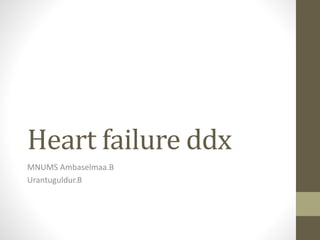 Heart failure is a clinical syndrome characterized by symptoms like breathlessness and fatigue caused by structural or functional abnormalities in the heart that reduce cardiac output. It generally refers to congestive heart failure, which can result from systolic or diastolic dysfunction. Left-sided heart failure is usually due to conditions like ischemic heart disease or hypertension and causes pulmonary congestion and edema. Right-sided heart failure more often stems from left heart failure or primary pulmonary disorders, presenting as peripheral edema. Pulmonary heart disease, or cor pulmonale, involves enlargement and failure of the right ventricle in response to increased pulmonary pressures, commonly from lung diseases like COPD.