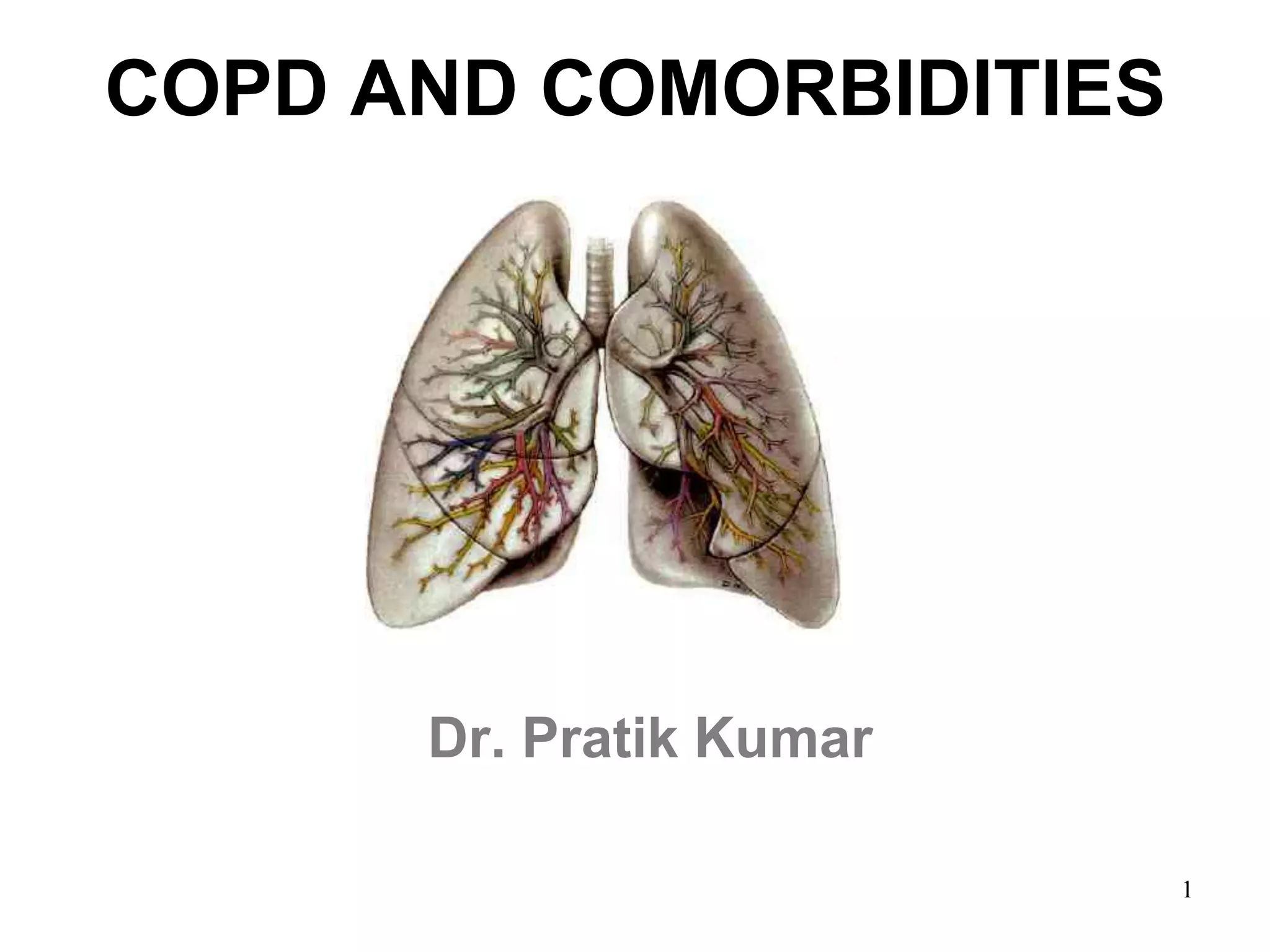 The document discusses COPD and its comorbidities. It defines COPD as a disease characterized by persistent airflow limitation associated with an inflammatory response in the lungs to noxious particles. COPD has several risk factors and a variable natural history. The key pathological changes occur in the central and peripheral airways, lung parenchyma, and pulmonary vasculature. This leads to several physiological abnormalities including airflow limitation, gas exchange impairment, pulmonary hypertension, and systemic effects. Diagnosis requires symptoms, risk factor exposure, and confirmation of persistent airflow limitation on spirometry. Assessment aims to determine disease severity and impact on health status and risk of future events. Comorbidities commonly occur and should be actively managed.