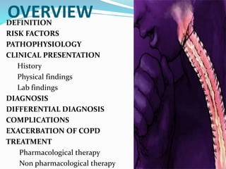 This document provides an overview of chronic obstructive pulmonary disease (COPD), including its definition, risk factors, pathophysiology, clinical presentation, diagnosis, complications, and treatment. COPD is characterized by persistent airflow limitation that is usually progressive. The major risk factor is cigarette smoking. Clinical features include cough, sputum production, and exertional dyspnea. Diagnosis is confirmed by spirometry showing reduced FEV1/FVC ratio. Treatment involves smoking cessation, bronchodilators, inhaled corticosteroids, pulmonary rehabilitation, oxygen therapy, and management of exacerbations with bronchodilators and antibiotics.