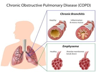 Chronic obstructive pulmonary disease (COPD) is a progressive and irreversible condition characterized by chronic dyspnea and airflow limitation, often caused by factors such as tobacco smoke and environmental pollutants. It comprises two main types: chronic bronchitis and emphysema, which may coexist and lead to various symptoms and complications requiring proper diagnosis and management. Effective management includes smoking cessation, bronchodilators, corticosteroids, oxygen therapy, and pulmonary rehabilitation, alongside patient education and monitoring.