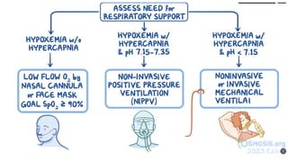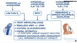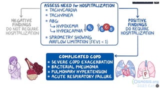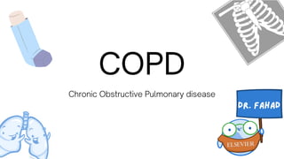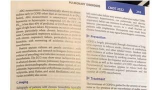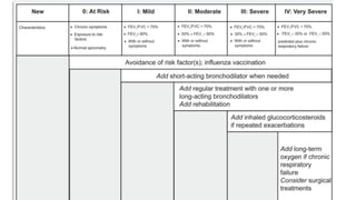 The document discusses chronic obstructive pulmonary disease (COPD), including its diagnosis, management, and emergency treatment measures. It covers key clinical features, diagnostic tests, and various treatment options such as smoking cessation, medication types, and surgical interventions. The document also highlights the importance of assessing exacerbations and outlines the prognosis for patients with different stages of COPD.