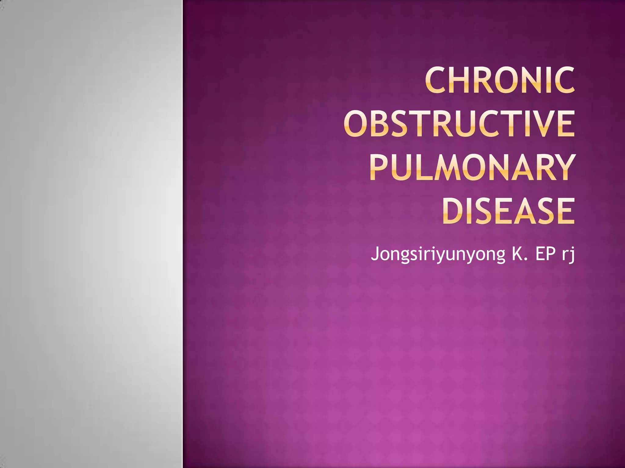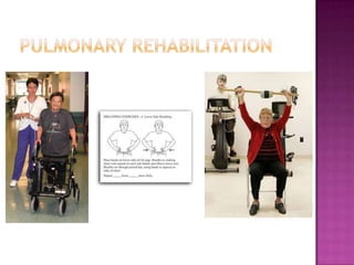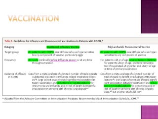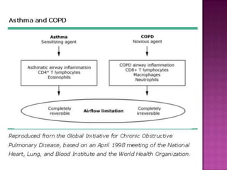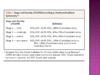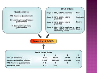 This document discusses chronic obstructive pulmonary disease (COPD). It defines COPD as a progressive lung disease characterized by airflow limitation that is not fully reversible. The main phenotypes of COPD are chronic bronchitis and emphysema. The document discusses the pathogenesis and risk factors of COPD, as well as the clinical presentation and complications. It provides details on diagnosing COPD through pulmonary function tests, blood tests, imaging and other evaluations. Treatment options are outlined for acute exacerbations and management of stable COPD based on disease severity. Management includes bronchodilators, corticosteroids, pulmonary rehabilitation, oxygen therapy and occasionally surgery.