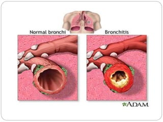 Chronic obstructive pulmonary disease (COPD) refers to two lung diseases, chronic bronchitis and emphysema, that are typically caused by smoking. In COPD, airflow to the lungs is limited by inflammation and damage to airways and lung tissue. Symptoms include cough, sputum production, wheezing, shortness of breath, and weight loss. Treatment focuses on smoking cessation, bronchodilators, oxygen therapy, and managing exacerbations. Nursing care aims to improve ventilation and gas exchange, manage anxiety, and ensure effective airway clearance and rest.