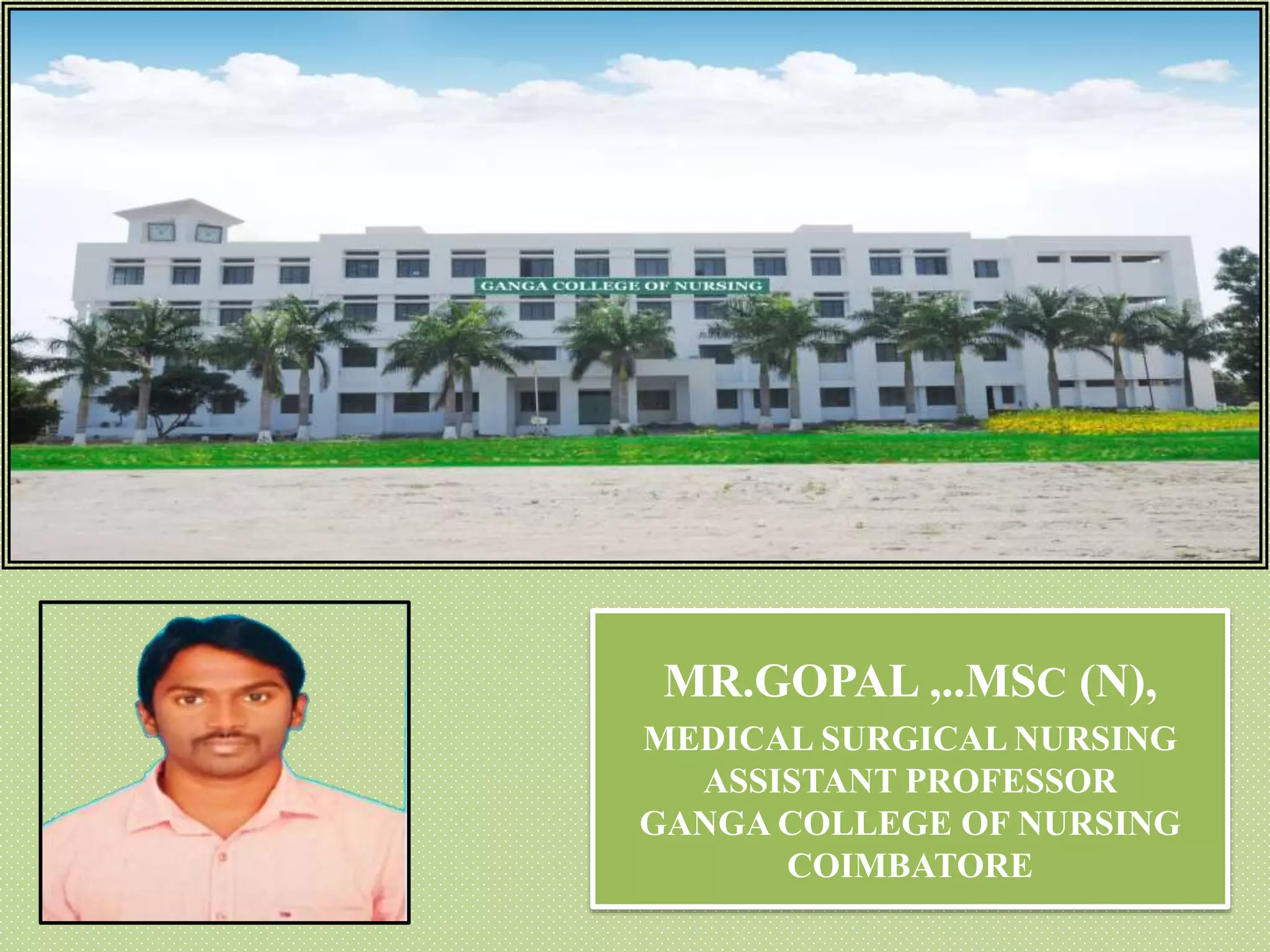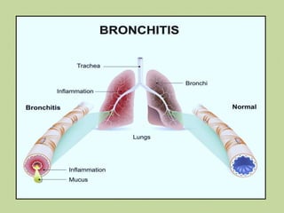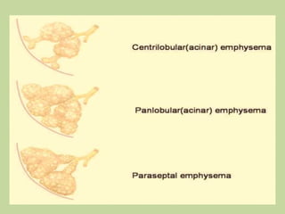 This document provides an overview of Chronic Obstructive Pulmonary Disease (COPD). It begins with an introduction to COPD, describing it as a common lung disease that makes breathing difficult. It then covers the anatomy and physiology of COPD, defining it as a progressive lung disease involving chronic inflammation and airflow obstruction. The document discusses the incidence of COPD globally and risk factors. It provides details on the pathophysiology, stages and symptoms of the disease. Diagnostic tests like spirometry and chest x-rays are described. The document outlines complications of COPD and approaches to medical management including pharmacology, surgery, and nursing care. It provides details on specific drugs like bronchodilators and corticosteroids used to