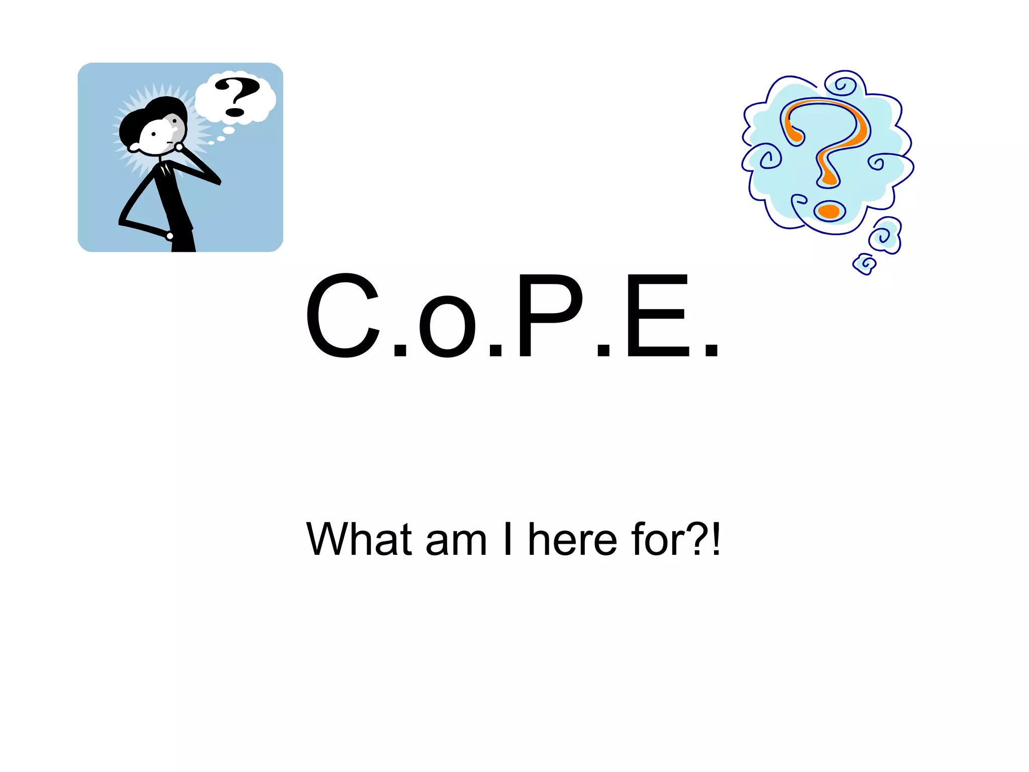 C.o.P.E. is a GCSE-level certificate program that develops key skills like problem solving, working with others, and self-improvement. Students complete skill units and challenges over two years to earn bronze, silver, and gold certificates. The challenges involve activities like charity work, hobbies, health/safety, crafts, work experience, travel, presentations, and discussing issues. Six credits are needed for a bronze certificate, earned through various challenge options.
