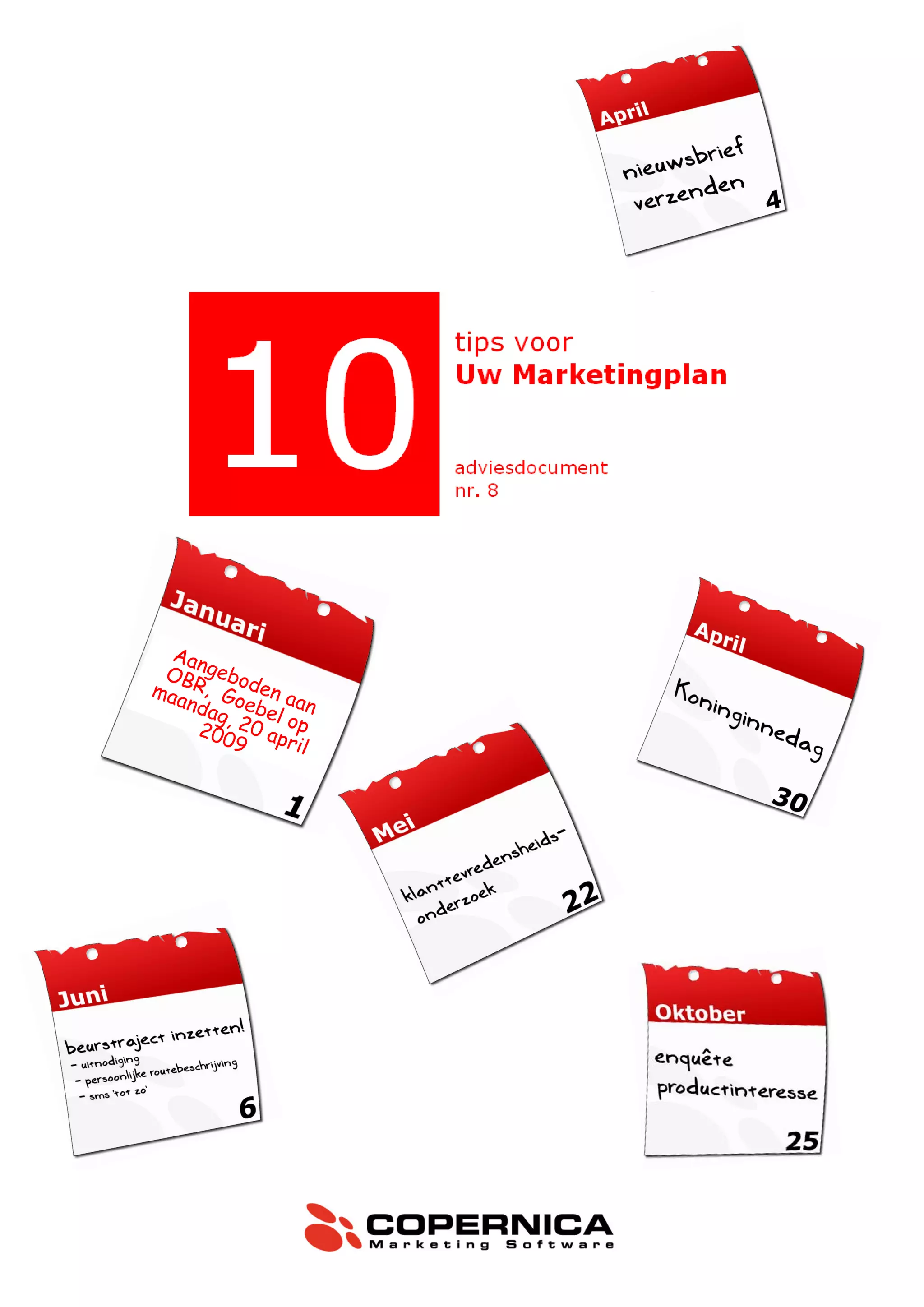 dagen voor Kerst breken voor velen van u ook direct de drukste dagen van het jaar aan. De laatste wapenfeiten worden aan de doelstellingen toegevoegd en tegelijkertijd moeten ook de doelstellingen voor het komende jaar benoemd worden. Copernica BV heeft zich door al deze drukte laten inspireren om een adviesdocument op te stellen waarin wij u praktische tips geven om uw organisatie volgend jaar positief voor het voetlicht te brengen. Dit adviesdocument maakt het u makkelijk om een aantal basiscampagnes en contactmomenten in te plannen. Haal het meeste uit uw relaties via doelgericht relatiebeheer, verrijking van uw relatiegegevens en doelgroeptargeting. Wij geven een aantal suggesties voor concrete acties die u kunt inplannen, zonder in te boeten aan originaliteit. De tips zijn zo geschreven, dat u ze enkel hoeft te knippen en plakken in uw eigen marketingplan. We geven aan welke boodschap u op welk moment, aan welke doelgroep kunt zenden en adviseren welke middelen u kunt gebruiken. Verander hier en daar een woord om de tips toe te spitsen op uw bedrijf en voilà. Over auteursrecht zult u ons niet horen! Wij hopen u met dit adviesdocument een goede basis te geven voor uw marketingplan. Mocht u meer willen weten over de toepassingen van de Copernica Marketing Software voor uw eigen organisatie, dan kunt u altijd vrijblijvend contact met ons opnemen. Aan de hand van een demonstratie bepalen we graag uw mogelijkheden. Tot slot wensen wij u veel communicatie- & marketingsucces, Regelmatig publiceert Copernica BV adviesdocumenten met praktische direct marketing tips. Wilt u voortaan de handige Copernica tips en adviesdocumenten als eerste ontvangen? Meldt u dan direct aan voor de gratis Copernica e-mail nieuwsbrief op www.copernica.nl. Hier kunt u ook eerder uitgegeven adviesdocumenten gratis downloaden. © 2008 Copernica BV www.copernica.nl 2009 Aangeboden aan OBR, Goebel op maandag, 20 april Pagina 1