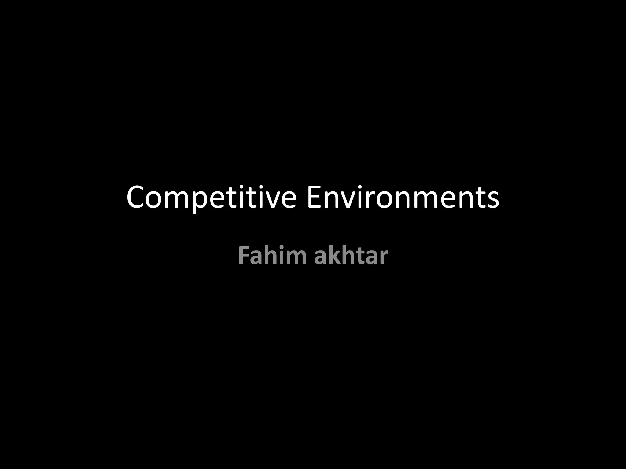 The document discusses concepts related to perfect competition and competitive strategy. It defines characteristics of perfect competition, including homogeneous goods and free entry/exit from the market. It then poses questions about assessing market attractiveness, competing for higher profits, and resources needed for competition. The document goes on to discuss barriers to entry like economies of scale, excess capacity, and switching costs. It also covers retaliatory barriers, forms of rivalry between firms, and how to analyze competitors by identifying and ranking them.