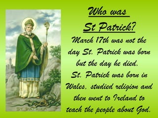 St Patrick's Day is celebrated on March 17th to honor St. Patrick, the patron saint of Ireland. It originated as a Catholic holiday but is now celebrated by people of all backgrounds. Symbols of the holiday include the shamrock and leprechauns. Major parades are held in Dublin and New York City, but celebrations also take place around the world, including Chicago dyeing its river green and a parade in Japan honoring Irish culture.