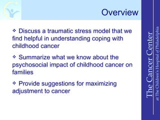 The document discusses the impact of childhood cancer on families, emphasizing the use of a traumatic stress model to understand coping mechanisms. It outlines patterns of emotional responses among children, parents, and siblings, highlighting distress levels at diagnosis and the potential for growth over time. Recommendations for managing the emotional turmoil include communication, establishing routines, and seeking external support.