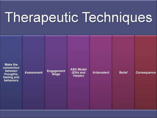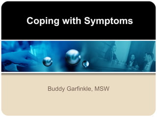 The document discusses various coping strategies and treatments for mental illness symptoms. It defines coping and explains why coping strategies are important. It then discusses common symptoms like negative symptoms, psychotic symptoms, and positive symptoms. Finally, it outlines several coping strategies and treatments that can be used, including medications, social skills training, cognitive behavioral therapy, behavioral techniques, cognitive techniques, and activity scheduling. The overall goal is for individuals to develop coping strategies to better manage their symptoms.