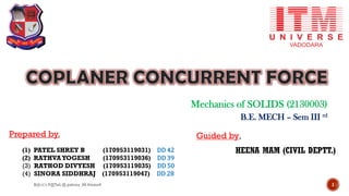 This document is a presentation on mechanics of solids that was prepared by four students and guided by Heena Mam of the civil department. It covers fundamental principles of mechanics including the principle of physical independence of forces, principle of transmissibility, principle of superposition, and resultant forces. Methods for composition of forces such as the parallelogram law, resolution of forces, triangle law, and polygon law are discussed. Lami's theorem is also introduced.