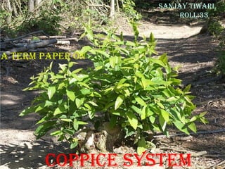 Sanjay Tiwari's term paper discusses coppice systems of silviculture. It presents an introduction, methodology, discussion, and conclusion. The discussion describes different types of coppice systems based on felling patterns. It also covers suitable species, conditions for applicability, and applications in Nepal. Research in Nepal found simple coppice can produce good fuel and fodder yields from tropical Sal forest in short rotations. The conclusion states that coppicing is a simple, low-cost method suitable for private or village lands near settlements.